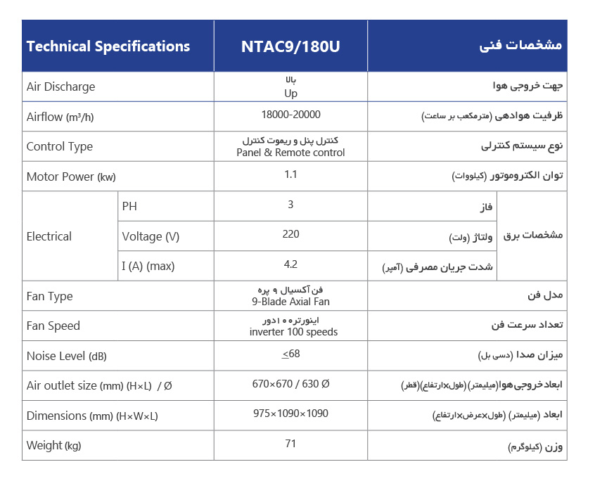 این مدل کولر با ظرفیت هوادهی 18000 مترمکعب بر ساعت در مدل روبروزن ، برای سرمایش فضایی بین 250 تا 400 متر مربع ( براساس شرایط کانال کشی) مناسب می باشد.